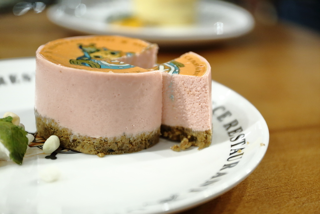 下層是威化餅乾底,上層則是淡淡的粉色乳酪,帶有櫻花味的雙重口感