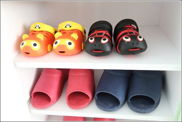 門口旁也設置了每個房間的專屬鞋櫃,裡面提供了大人小孩的室內脫鞋,但小孩的脫鞋對姐弟倆而言都太小啦!