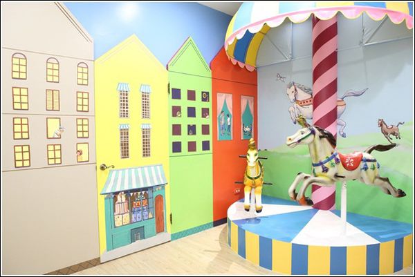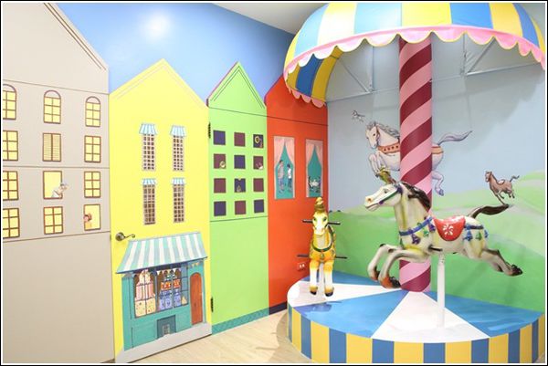 推開大門就看到舞台上的兩個旋轉木馬,搭配旁邊一整排色彩鮮艷的房子壁畫,讓人感覺充滿了童趣及歡樂的氣氛呢!