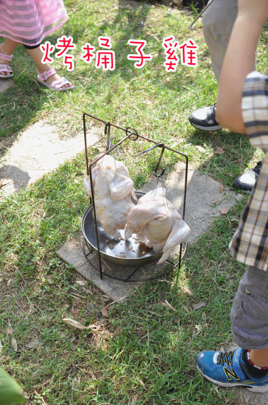 一邊等待烤地瓜 另一邊也要開火來的烤桶子雞