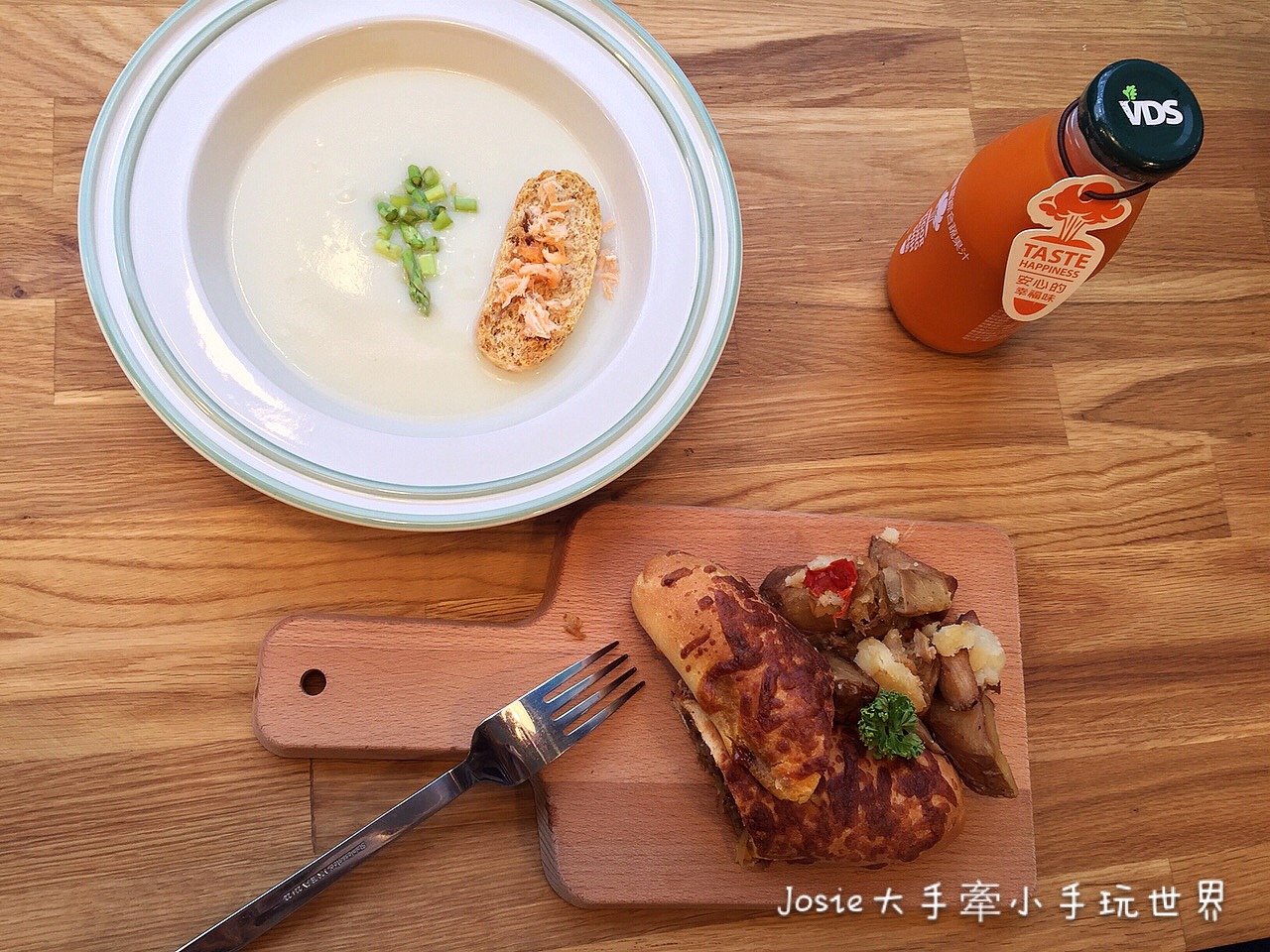 Josie就隨意點了乳酪牛肉捲、瑞典鮭魚蘆筍濃湯和100%瓶裝胡蘿蔔汁