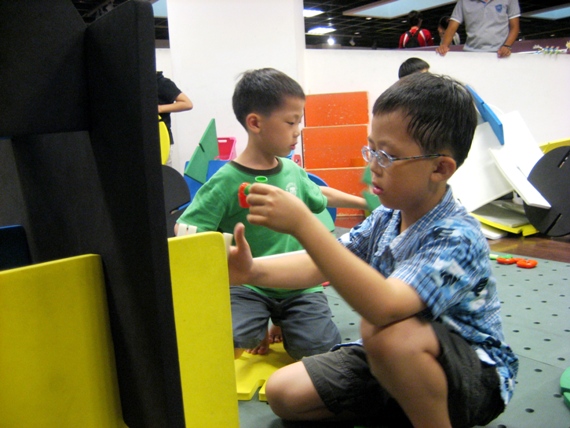 大塊積木區應該是給小小孩操作的地方,這兩個平常玩著小塊樂高積木的人也要來湊上一角,這也讓我開始懷疑這裡的「兒童遊戲區」是否也很快的不應再屬於他們兩這個年紀的小孩該來的地方了。