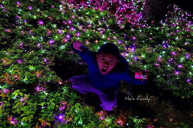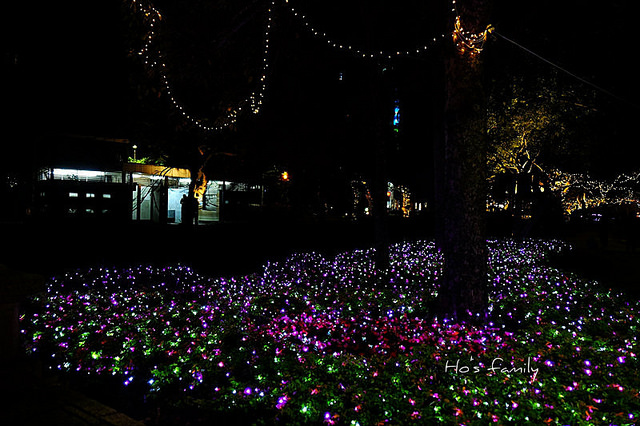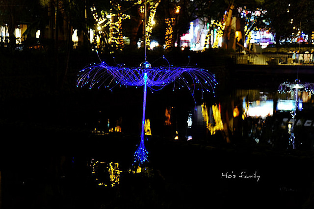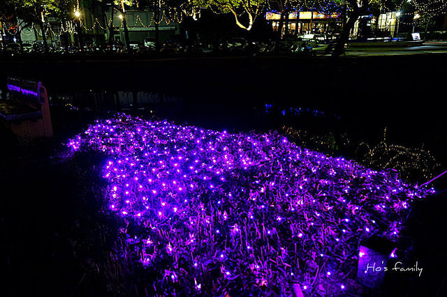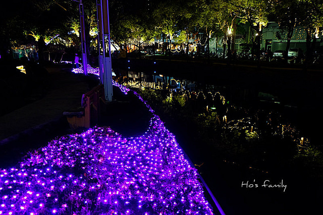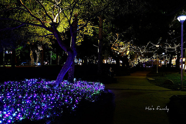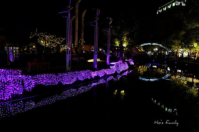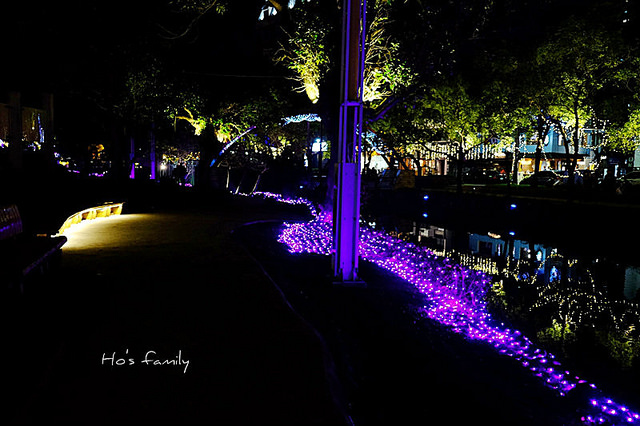 沿著護城河岸走,樹叢間打上燈光充滿奇幻色彩。