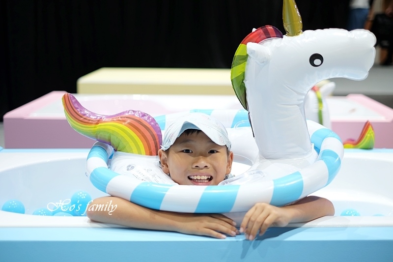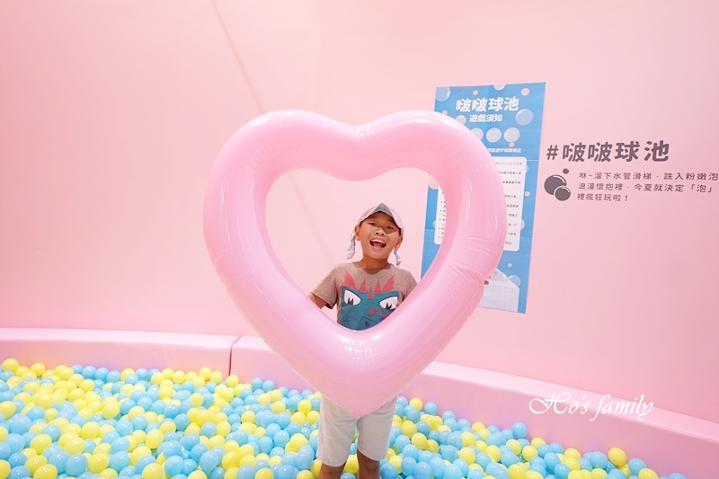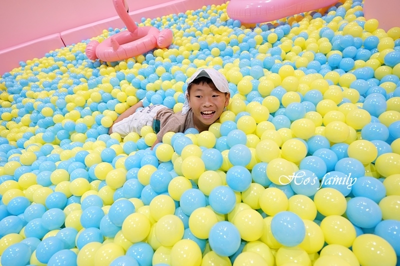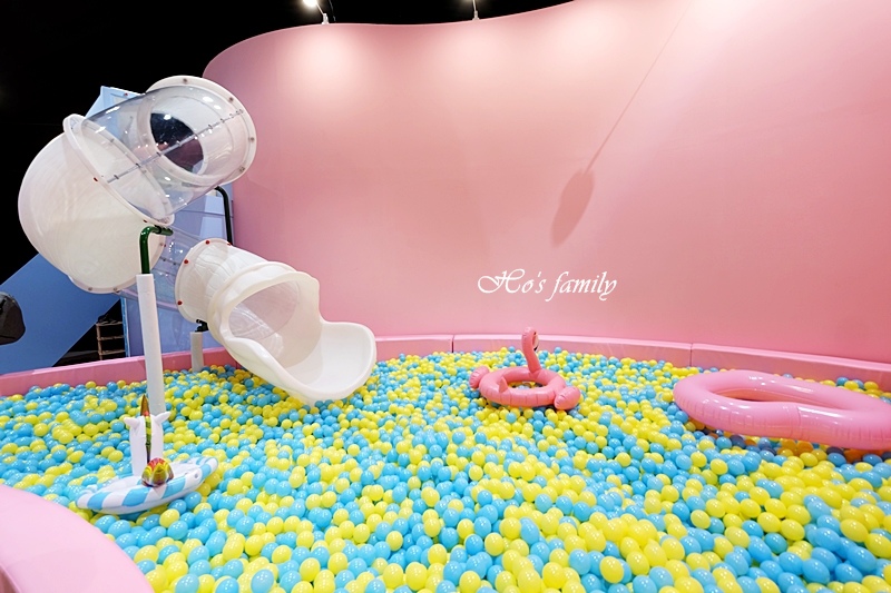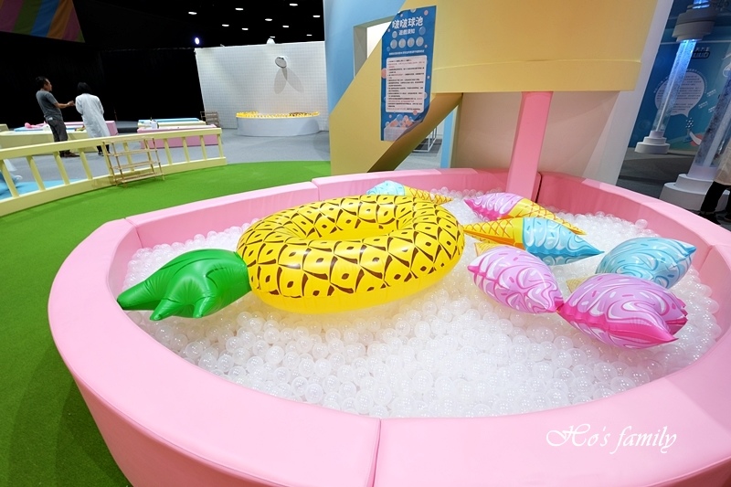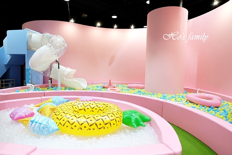超粉嫩的景致呈現在眼前,少女心大噴發了!一起來泡在粉紅泡泡的浪漫懷抱裡!黃藍顏色球球堆疊而成的球池有一座透明旋轉溜滑梯好吸引人,球池裡還有許多造型泳圈;另一座球池由透明球球堆疊,有著卡哇依大鳳梨及冰淇淋充氣泳具,看起來好拍又好玩呀!