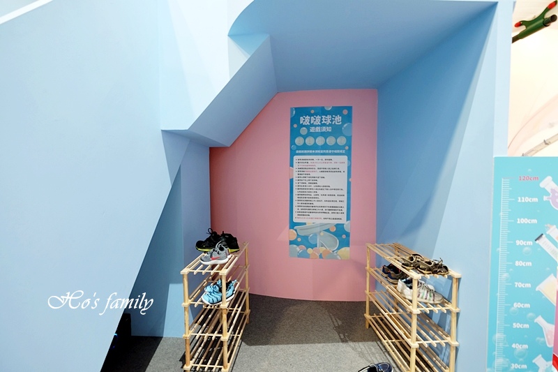 這一區是需要穿襪脫鞋的,溜滑梯下方備有鞋櫃可以置放,爬上樓梯就能玩溜滑梯囉!底下還有紅鶴等著大家!