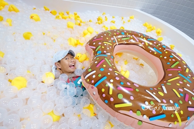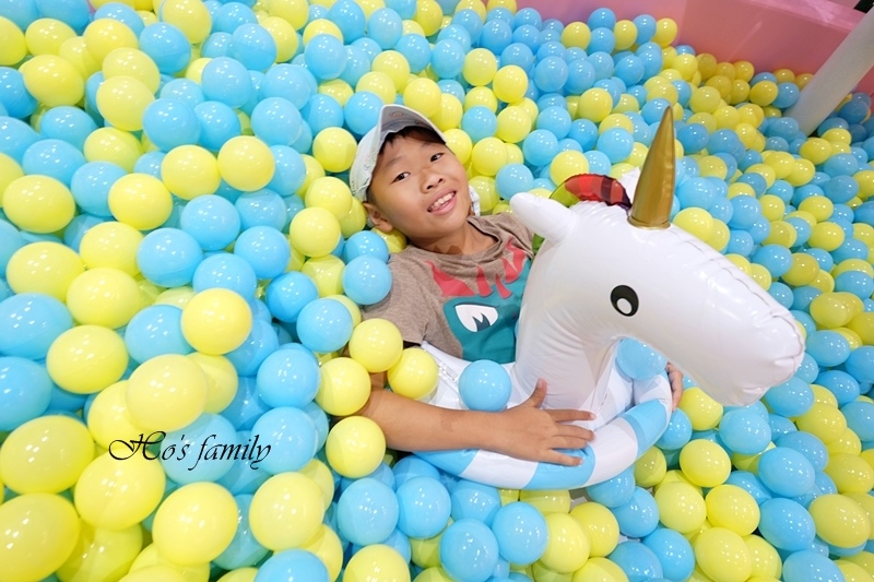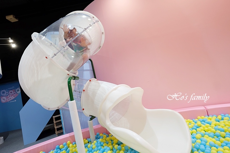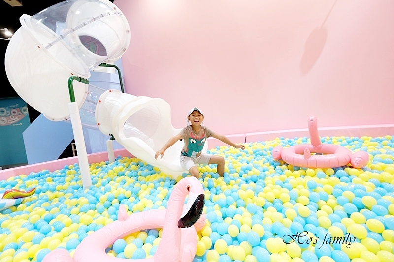 「Hi,馬麻!」興奮的YO哥從上面快速地溜下來,好嗨森,咻一下便滑進球池裡,泡在裡面好過癮!