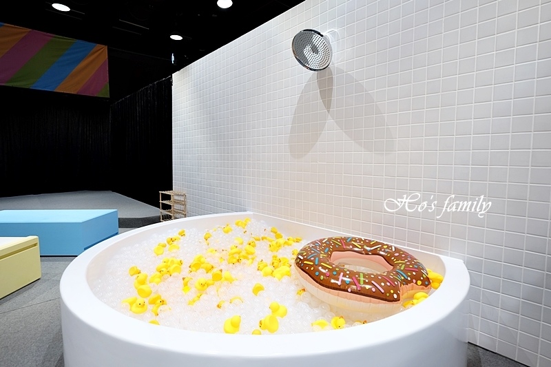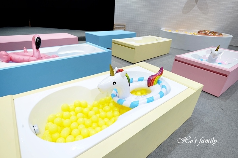 另一邊更壯觀了,六個小浴缸排排站,裡面還有各種顏色的球及造型泳圈,整個人坐進去好好拍,網美網帥拍照打卡上傳超吸睛!