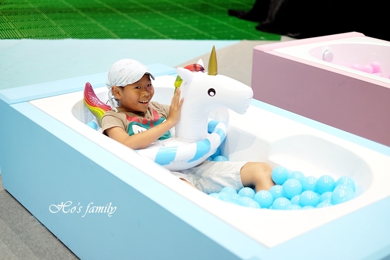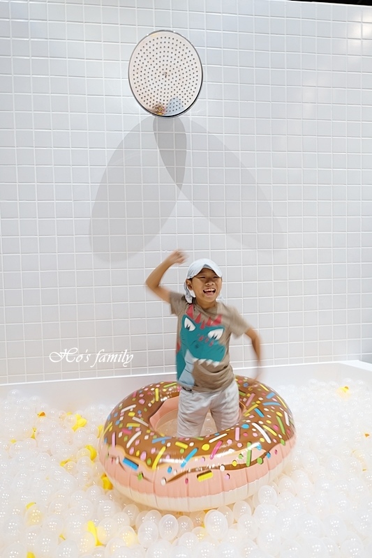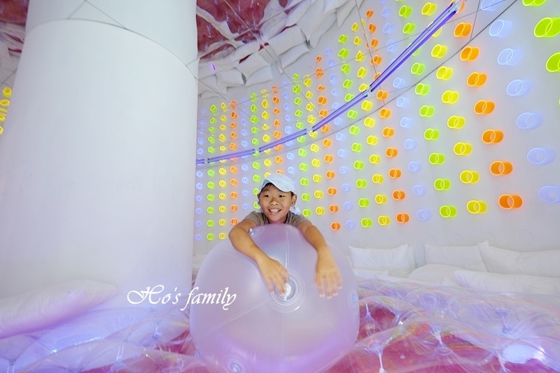 YO一直說這畫面好療癒,的確看起來好舒服,沒想到要爬起來還有難度,球池好深,快站起來又滑進去,逗得我們都哈哈大笑!
