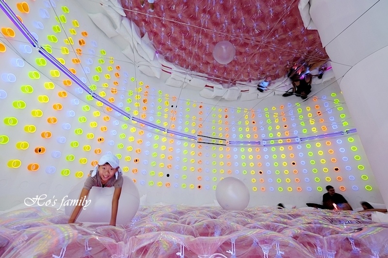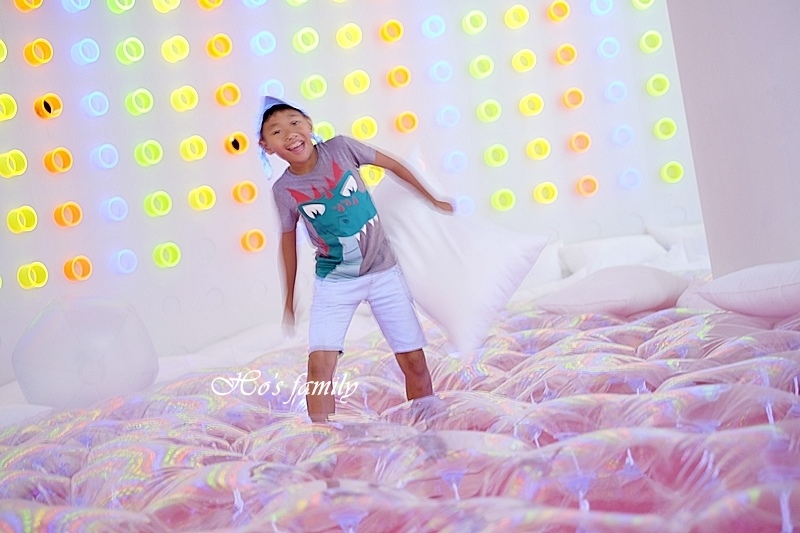 這是我們見過最特別的裝置,結合螢光場景與彈跳床,上面還有鏡面反射出影像,不但好玩也好拍!