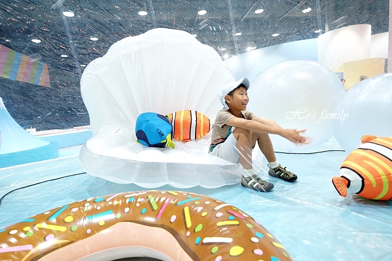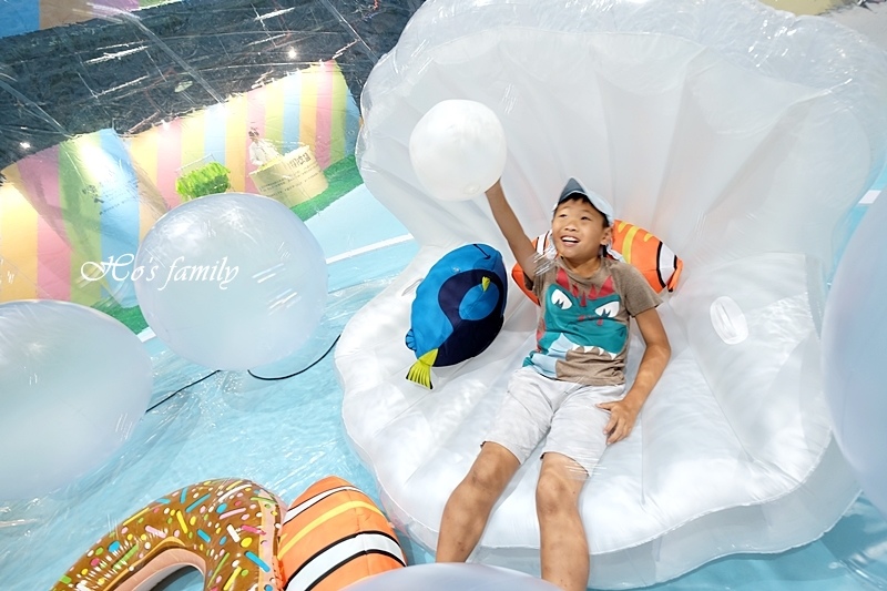 還有一個充氣大貝殼泳具,小美人魚今天不在家,就由小網帥來客串!
