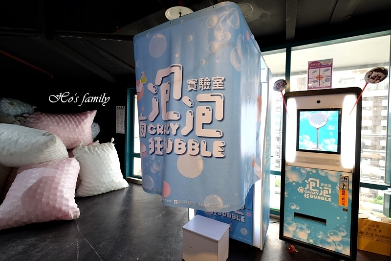 最想玩的就是「泡泡時光凍結機」,也就是被泡泡包起來的遊戲。我們在奧森兒童博物館、台塑生醫健康悠活館等都有玩過,來到瘋狂泡泡實驗室也想玩,沒想到才開展第一天設施就在維修,實在令人覺得惋惜,主辦單位應該等所有設施都準備好在開展才對啊!