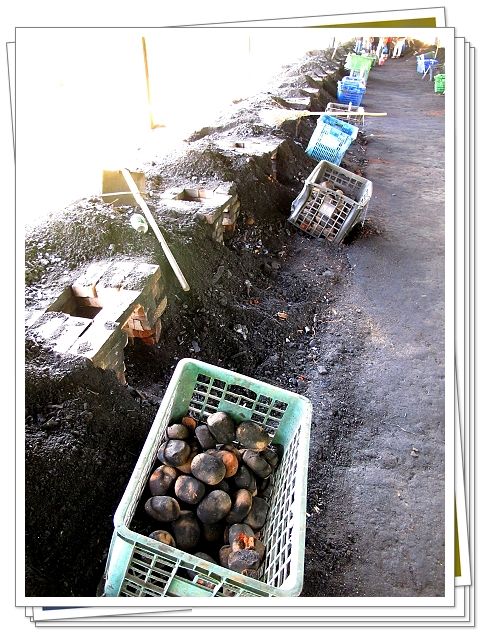 土塊燒紅後把食材丟入...最後為了保存熱度來悶熟食材,就要用細炒把所有散熱點都蓋好.不過這土我猜是過度使用,已經變的焦黑了吧.