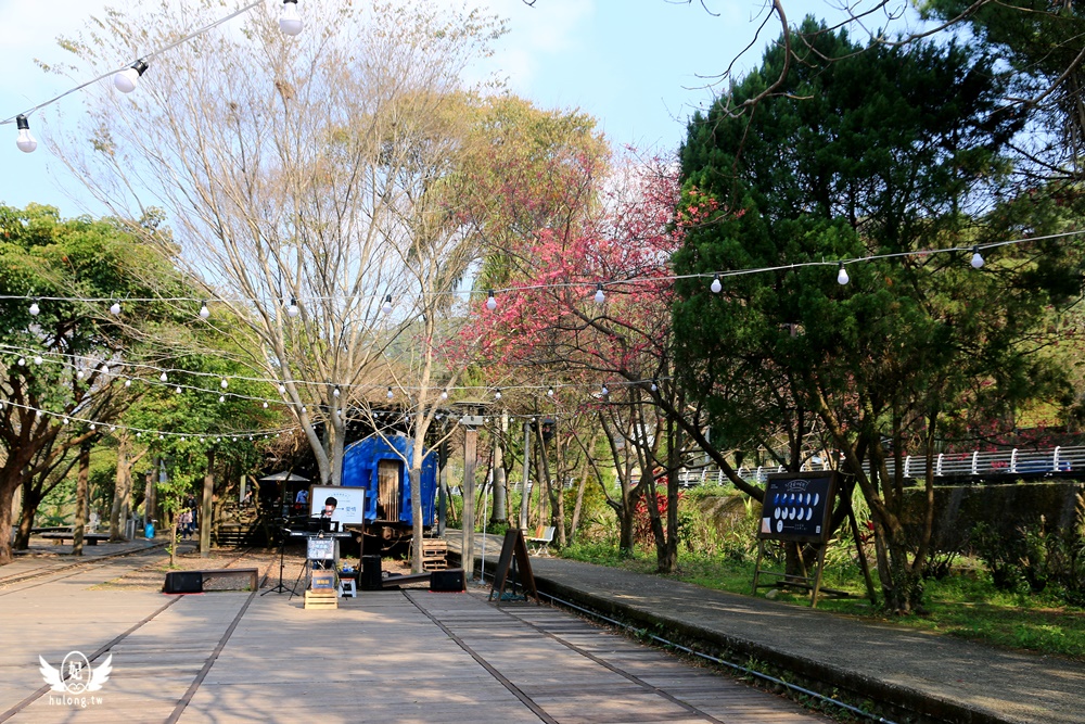 一旁的廣場上有街頭藝人駐唱,櫻花樹也悄悄露出嬌艷花朵,與園區的愛情氛圍好搭呀