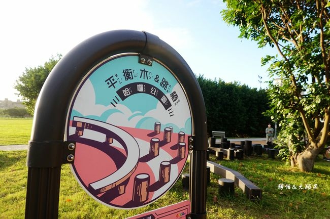 很特別的是這個兒童遊戲場沒有一般公園常見的溜滑梯、鞦韆等設施,設施都是比較新奇有特色的,像是環形起伏車道、搖搖小巴和小車以及平衡木跳樁,平衡木跳樁很多公園都有,但像這麼大片又多變化就比較少見了!