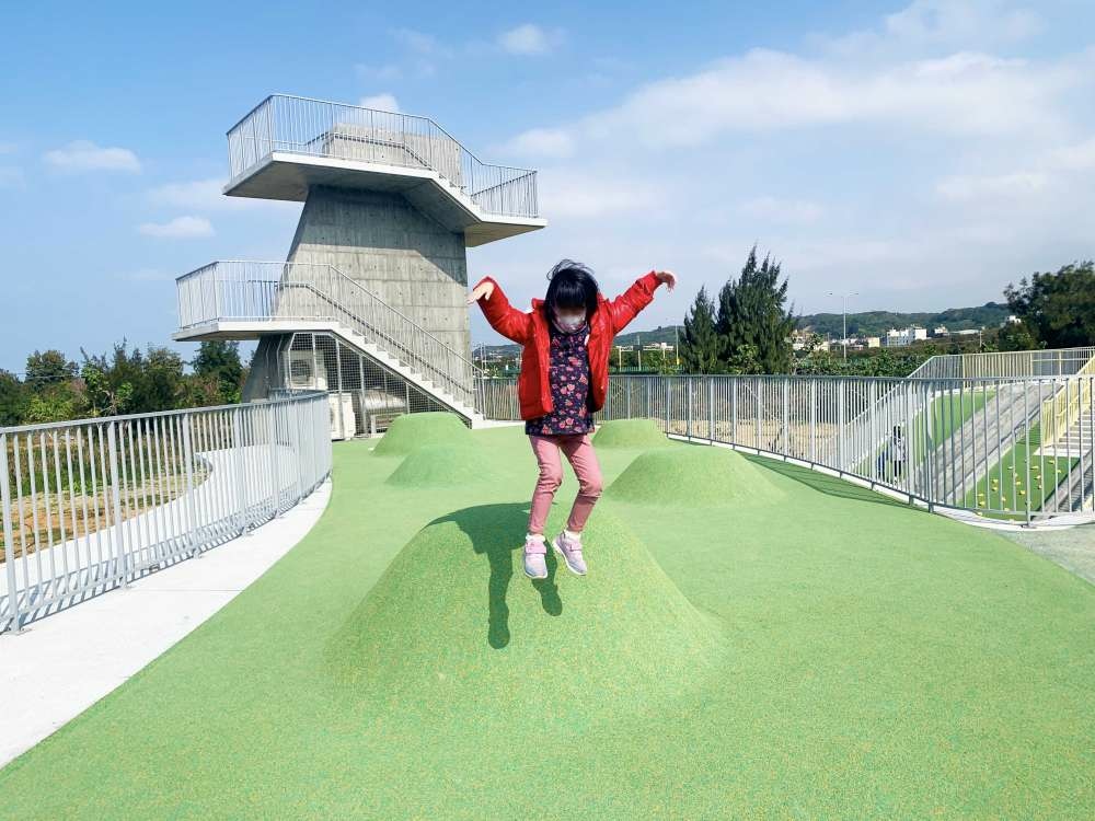 ▼綠色小山丘的鋪面是PU軟材,後面是觀景臺