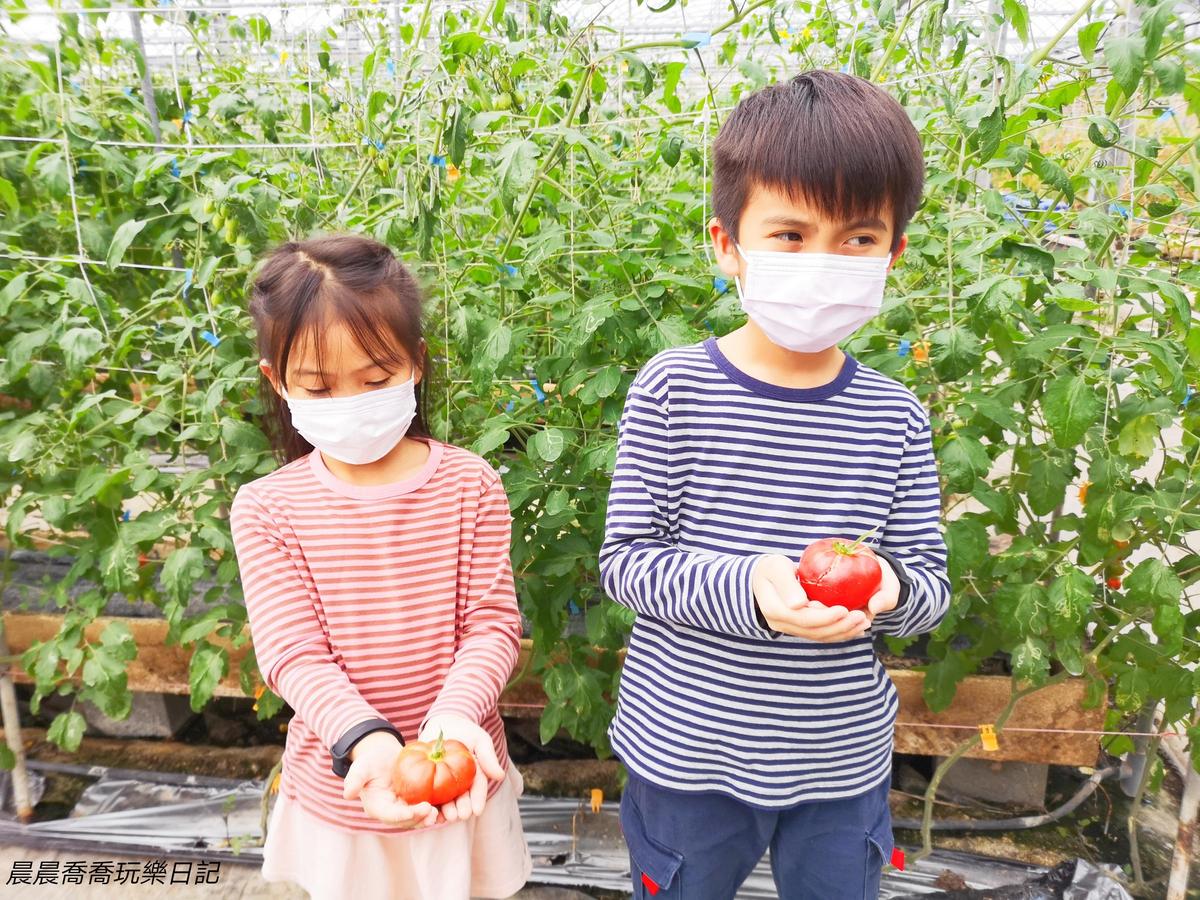 晨晨喬喬各採了一顆桃太郎番茄,洗乾淨之後就品嚐了起來,桃太郎番茄吃起來口感綿密,微酸微甜很好吃喔!