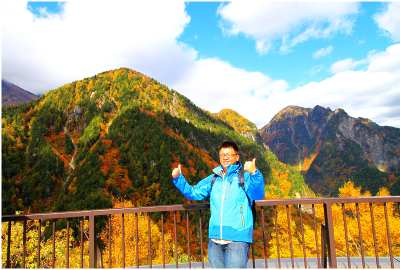 ▲走上黑部水壩!只能說夭壽美麗!整個山頭都被紅葉染紅啦!