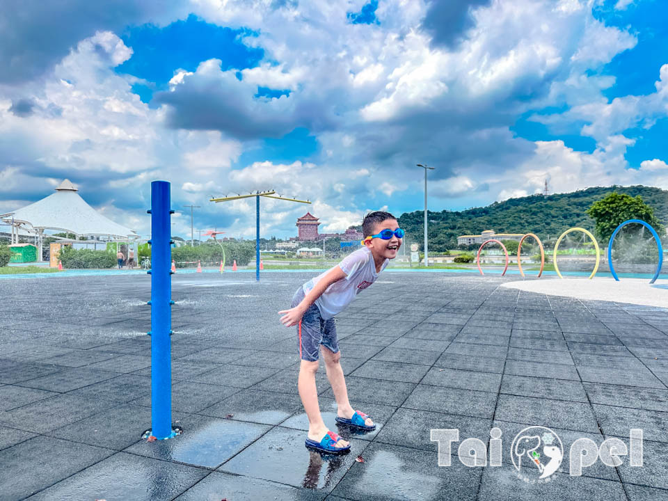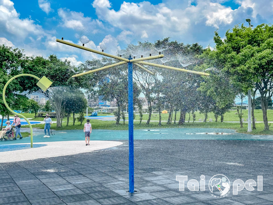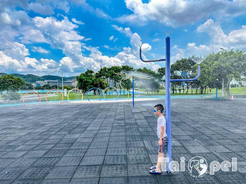 ▼大佳河濱公園的戲水區不適合high咖,在這裡想全身濕還不是件容易事,得全身靠近灑水器並將雙手打開,才能感受到水慢慢滲透到身體的涼意。