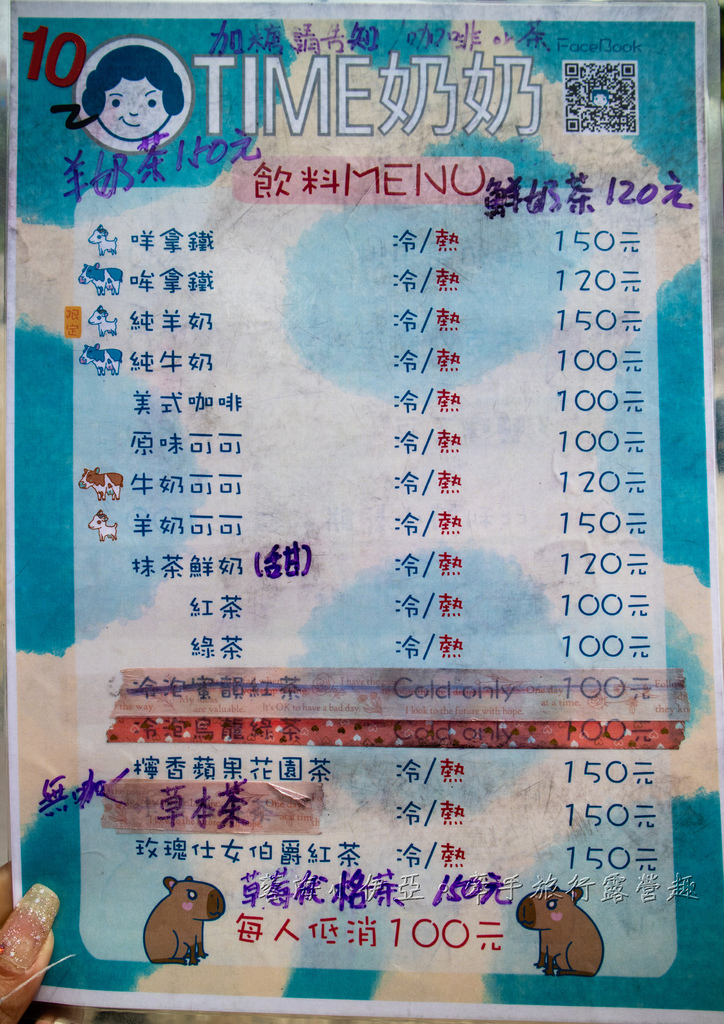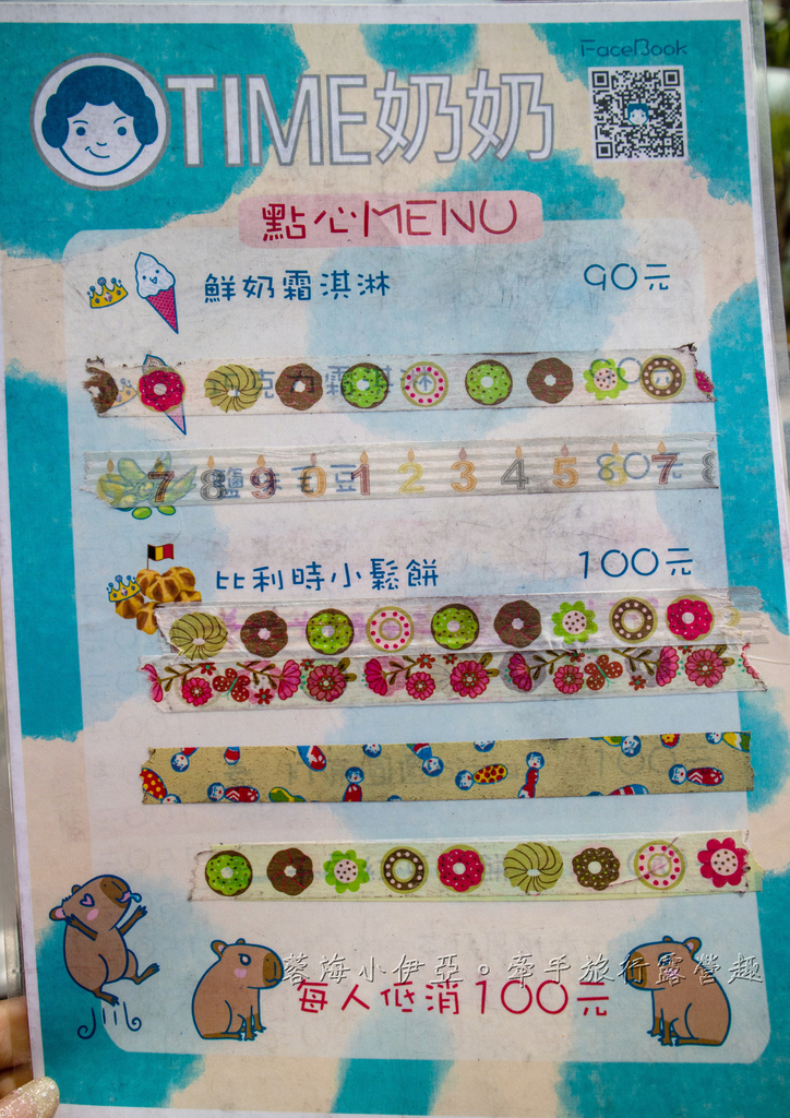 Time奶奶樹屋咖啡樂園以輕食、飲料為主,有咖啡、羊奶、可可、比利時小鬆餅、霜淇淋等餐點,價位落在90-150元之間