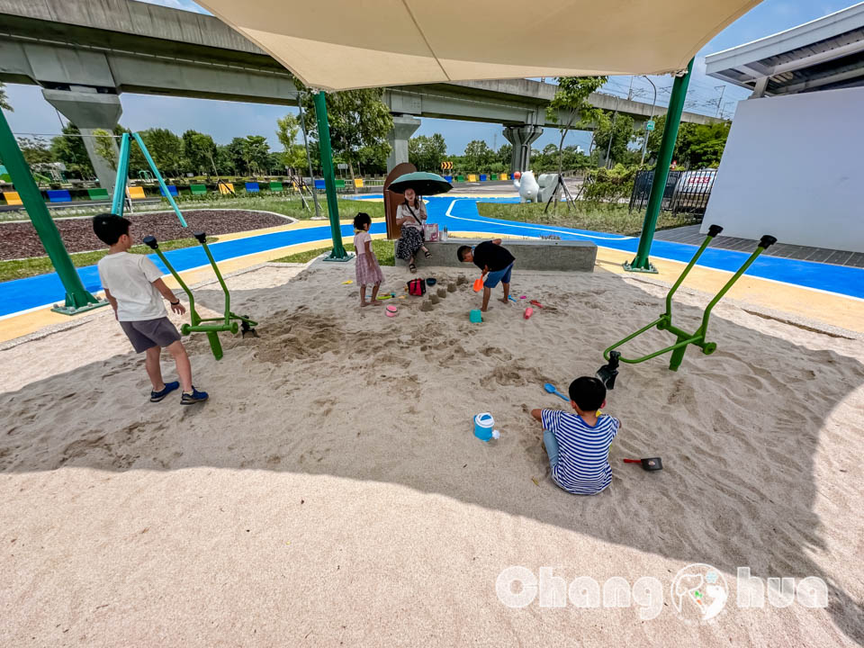 ▼熊趣米公園裡唯一有遮陽設備的遊戲區就是遊戲沙池,炎炎夏日裡也是人潮最多的一區。愛玩沙的孩子們別忘記帶上心愛的玩沙工具,沙池裡也有兩架挖土機可以運用喔~