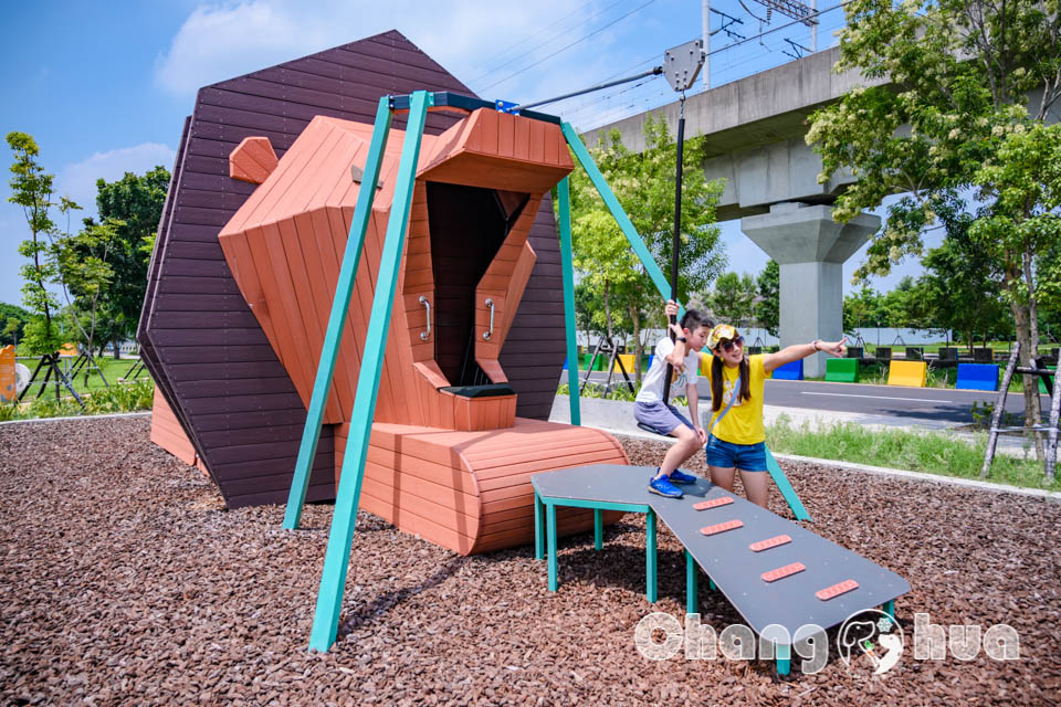 ▼共融鞦韆和擺盪大索由戴著藝術帽的熊熊守護,若是夏天前往,建議下午五點過後在到,遊具才不會發燙。