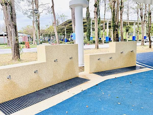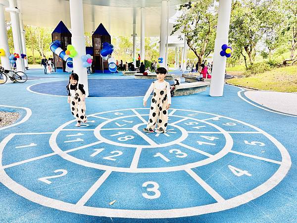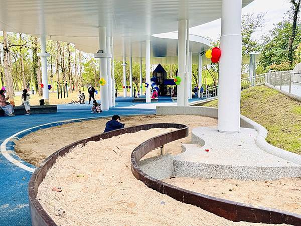 戲沙池、多功能廣場、跳格子 沙坑在遮棚下,可以玩更久,搭配戲沙台也更有趣味,旁邊就有洗手洗腳區很貼心,愛玩沙的孩子一定要記得自備工具來玩,休憩長椅就能直接看顧孩子這點好方便爸媽啊!