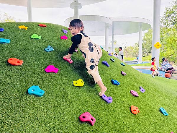 冒險山丘 (超咕溜大磨石子滑梯+草皮山丘+彩色攀岩)這區是當天去玩最熱門的區域,磨石子滑梯超級估溜好玩,連大孩子都抵擋不了它的魅力,草皮山丘也能當滑草區直接溜下來,大人也能跟孩子同樂唷~(這區建議脱鞋玩更能維持住遊玩場域整潔)