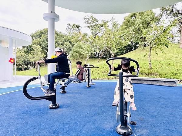 多功能體健區、遮棚籃球場 體健區的設施算是很豐富,有飛輪可以玩唷!小孩放電之餘,大人也能運動一下!籃球場域非常大,也很適合青少年來這裡打球~