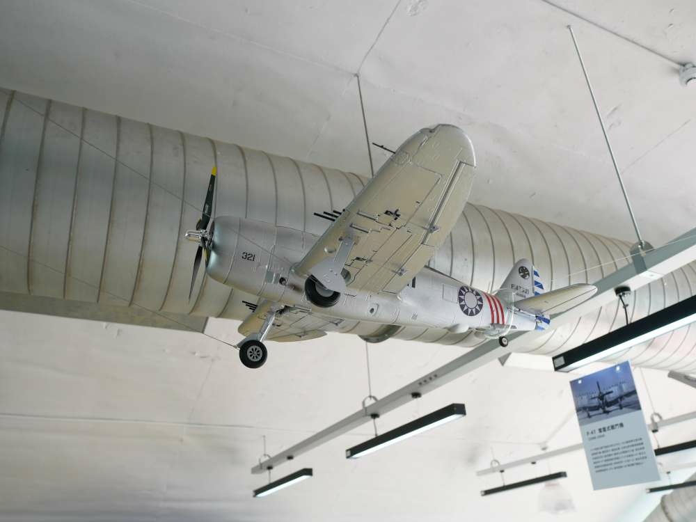 ▼抬頭往上看,還有許多飛機模型陳列在上面,照片中的就是P-47雷霆式戰鬥機。