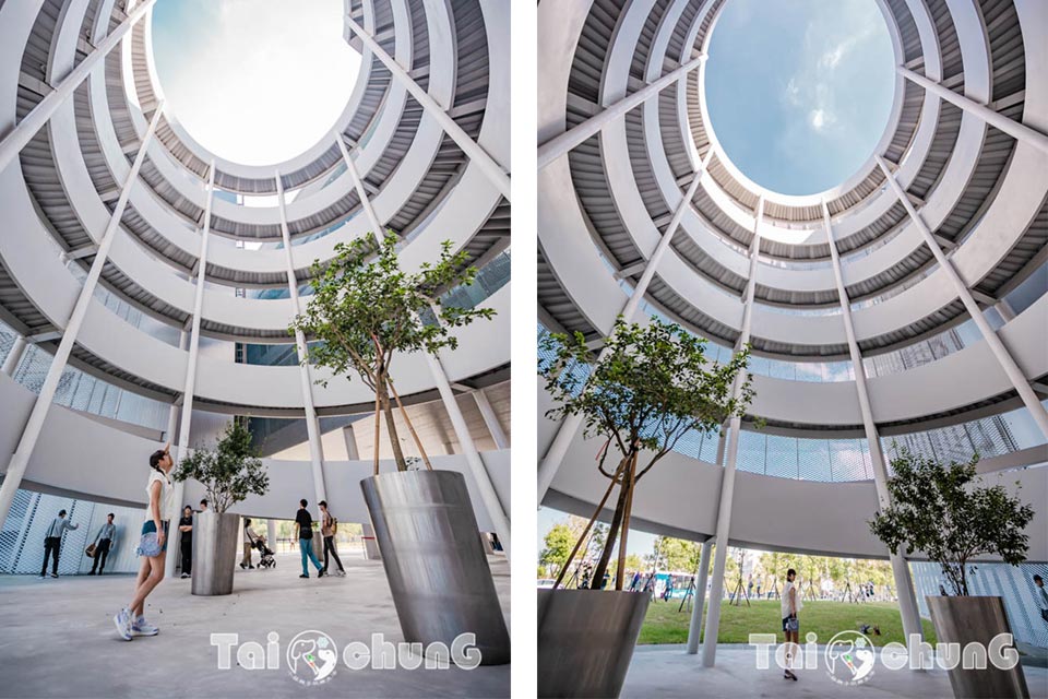 ▼【文化之森】仰頭可以直接看見天空、周圍有綠色植栽的半戶外空間蠻有意境的,不過此區沒有冷氣,夏天會比較熱一些。同樣有通道(2樓、5樓)可以串連圖書館和美術館。