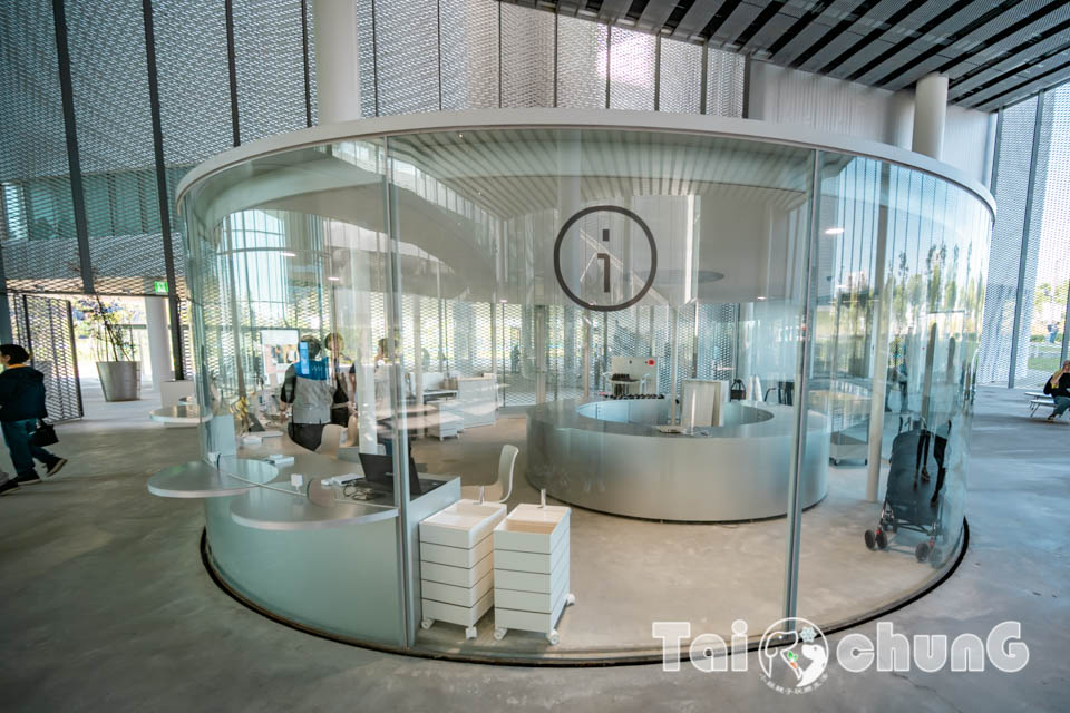 ▼鏡面水池旁是顯眼的服務諮詢台,弧狀又全透明的設計很少見。(備註:臺中綠美圖有提供團體導覽預約服務,可預約一個月內的導覽,更多相關資訊可至臺中綠美圖官網查詢)