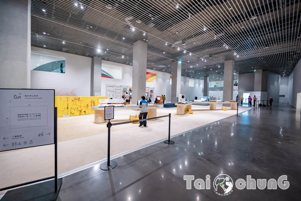 ▼寓教於樂的互動裝置設計相當成功,從認識美術館庫房裡的常見媒材開始,大小朋友都可以動動手體驗。(備註:米色地板區域需拖鞋入內)