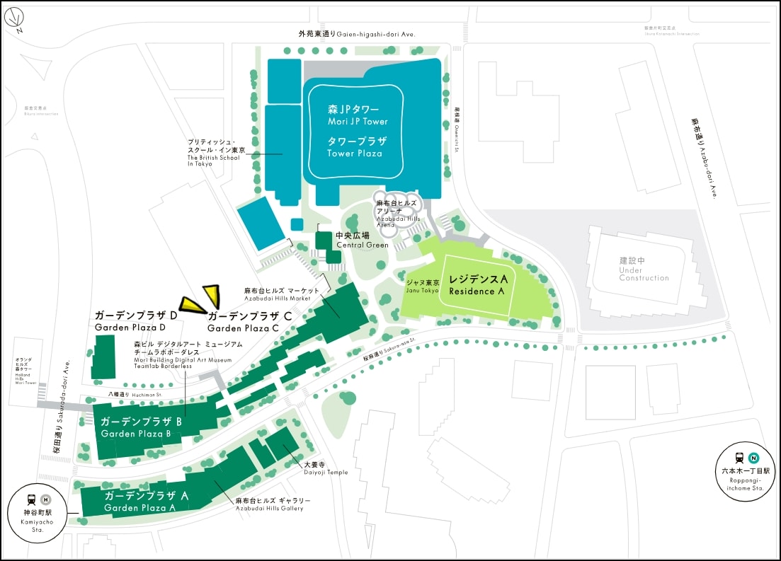 Comme’N位於麻布台之丘的花園廣場C的B1樓層,搭地鐵的話從日比谷線的神谷町站五號出口最快抵達。(以下圖片擷取自官網)