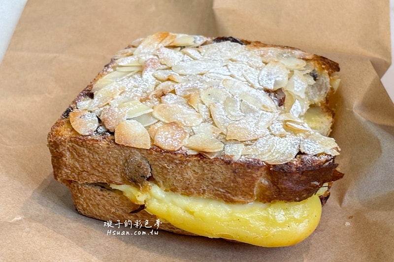 最後挑了一款人氣排名四的,麵包中間擠上滿滿的卡士達醬,吃起來不會很甜膩,外層還有脆脆的杏仁脆片,好吃極了!