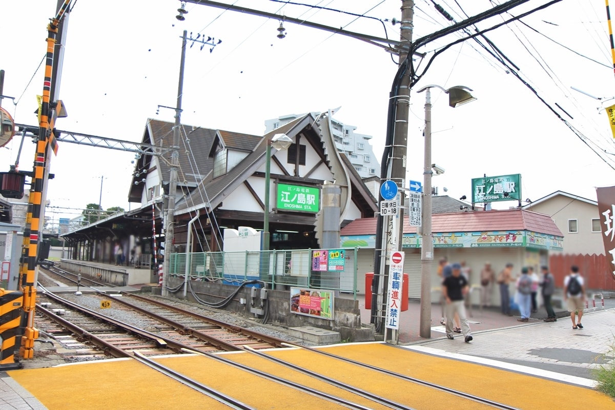 江之島站鐵路路線是設在一般道路的路面上,必須直接步行跨越鐵軌才能到達對向月台。